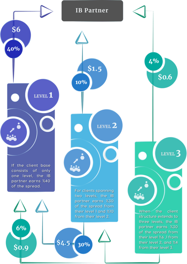 If you haven’t expanded your team structure to three tiers yet but are intrigued by our broker’s IB plan, please note that you’ll receive 40% of the spread at level one instead of the previously mentioned 30%, resulting in $6 per lot of EUR/USD trading. By expanding your team and adding another level, you’ll earn 30% from level one and 10% from level two, totaling $4.5 and $1.5 respectively.